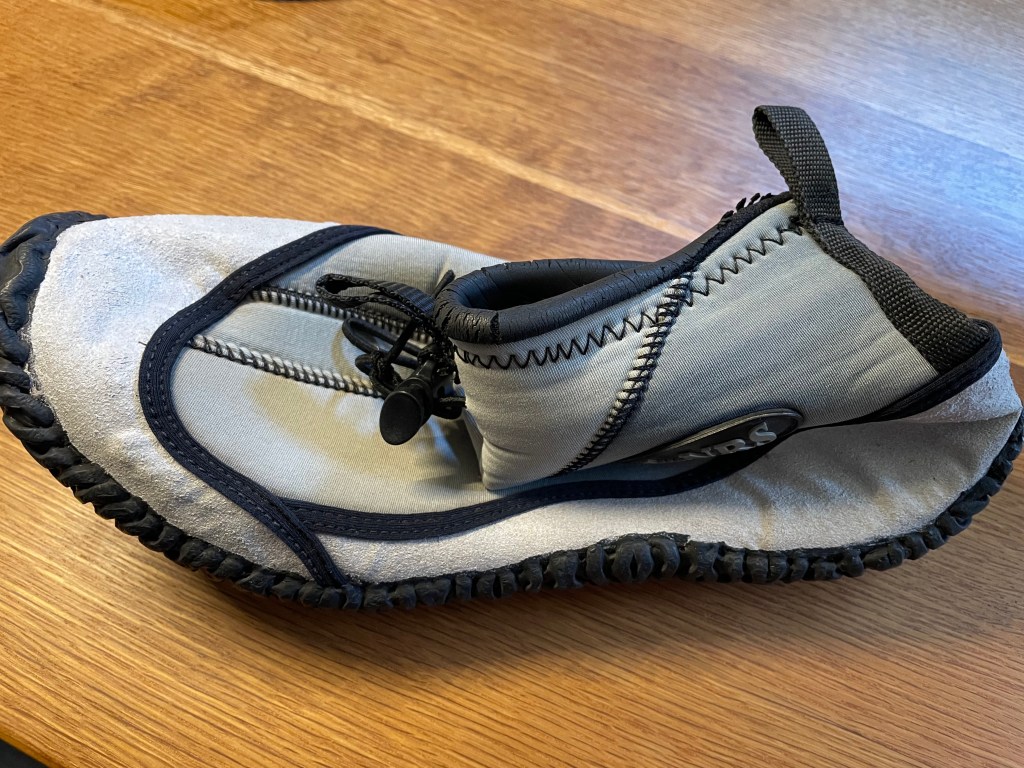 Because Ed and I will paddle in early May I want to make sure that I have my dry suit with its new wrist gaskets. I see the tightly folded Farmer John wetsuit for Ed and a synthetic shirt. Reassured by what I am finding, I unzip the side pockets of the gear bag. Here I find my old neoprene booties and wonder if they will get me through another season. The ankle gaskets have cracked. I’ll give Ed my paddling gloves and trust my hands calloused from gardening to hold up under the friction of paddling. Ed can have the Pelican box for his phone. I make sure that the first aid kit has a spare key to the truck, my old Swiss Army knife, appropriate bandages, medications, a pen, tourniquet, and Ace bandage. In the opposite pocket I see my cerulean-colored paddle jacket that I love to pull on over my head and shoulders.