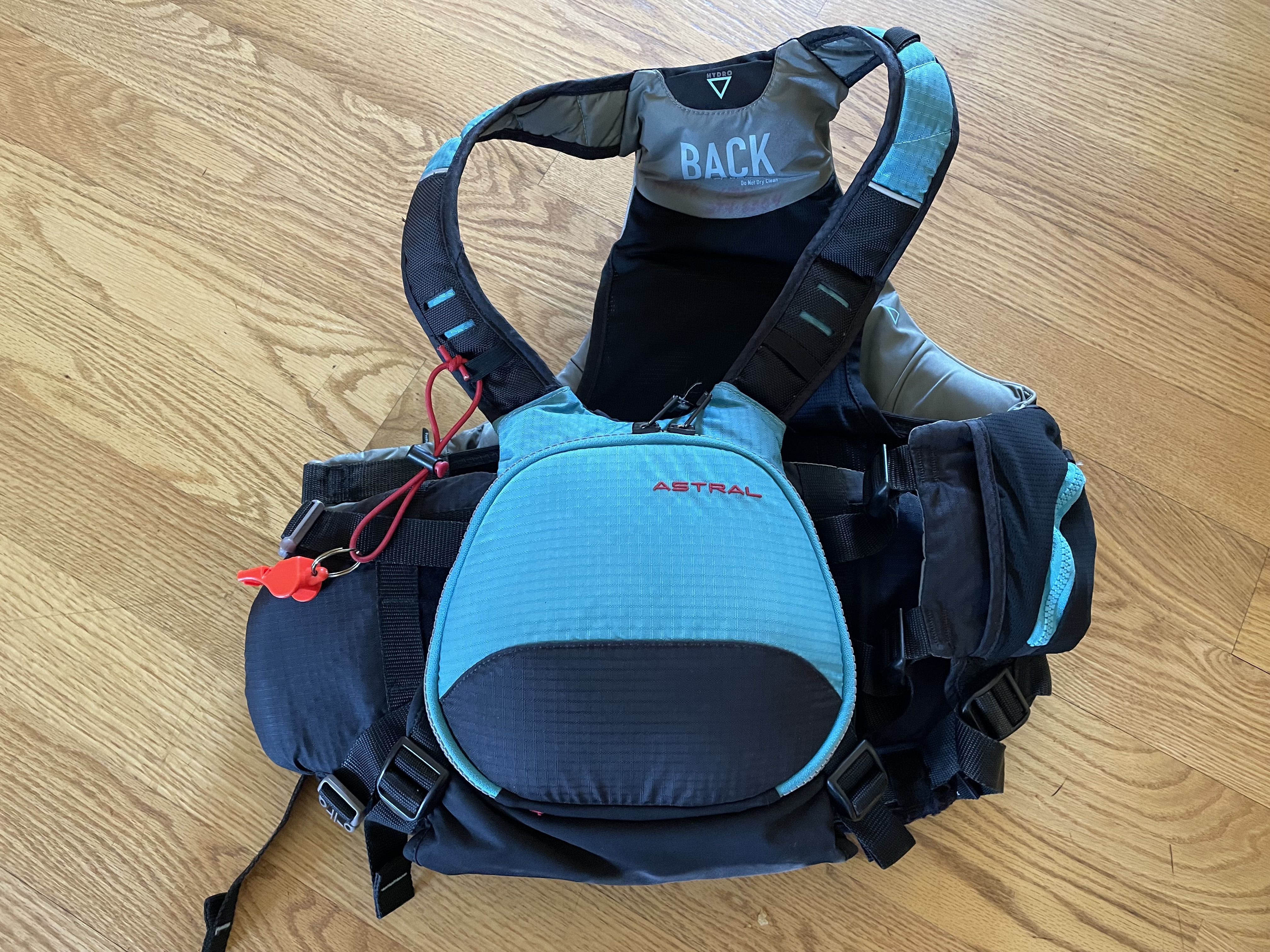 I pull out my Astral personal flotation device and test my memory of what I put where. Is the extra energy bar still in the narrow pocket and is the wider pocket still available for my phone, at hand when I want to take a photograph but also available in case of emergency? Do the inner pockets still contain nose plugs for later in the summer when I practice self-rescue techniques, extra sunscreen and lip balm? Does the small outer pocket on the left contain a stirrup to help me step up to the cockpit in the event of an unexpected spill? Does the opposite little pocket contain a paddle leash for exceptionally windy conditions?