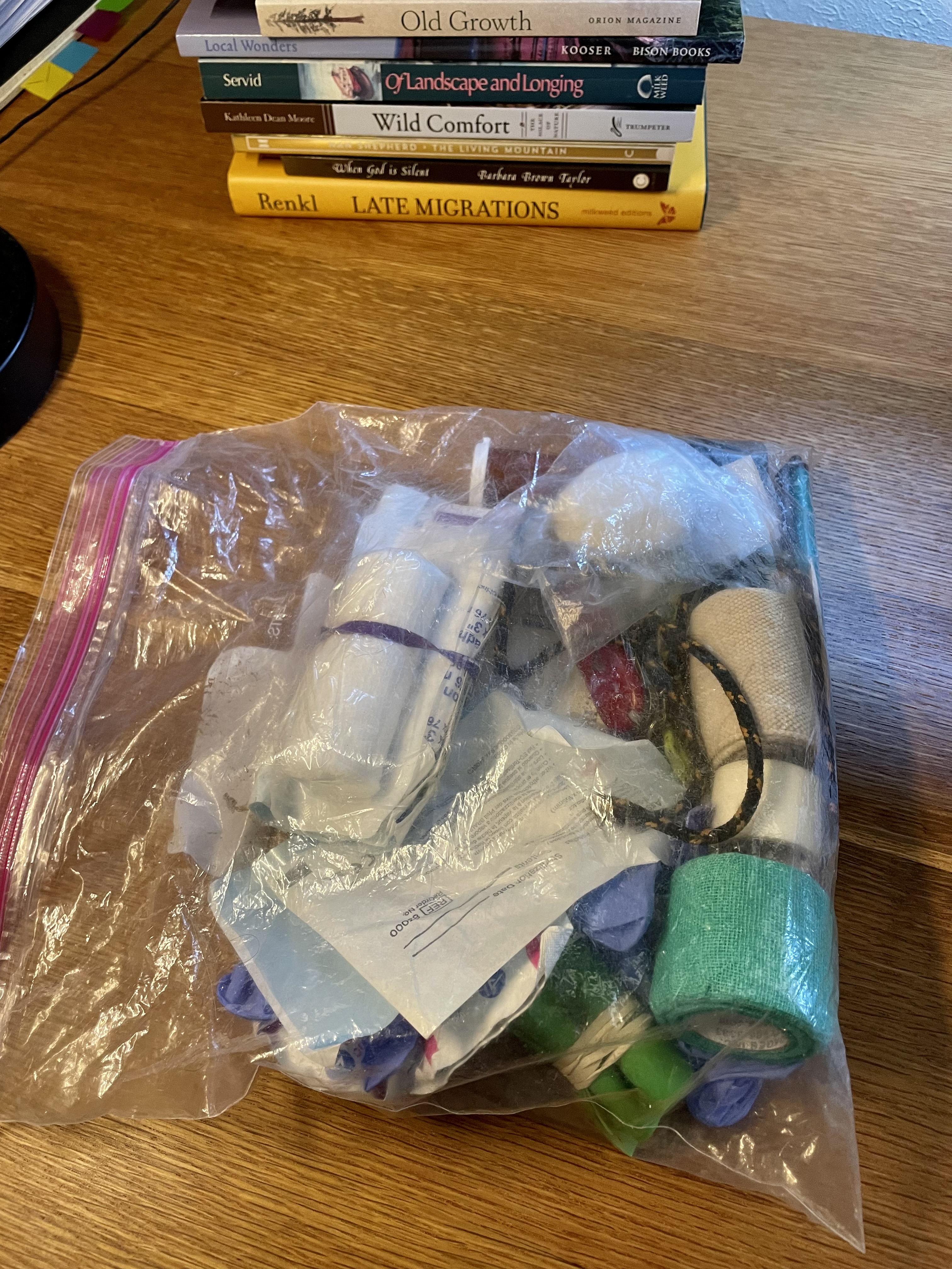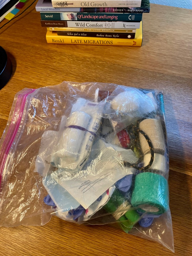 I review what I’ve placed in the lime green bag for emergencies—water pump, fire-starter, a can of sardines, pouch of electrolyte solution, a towel, headlamp, and knit hat.