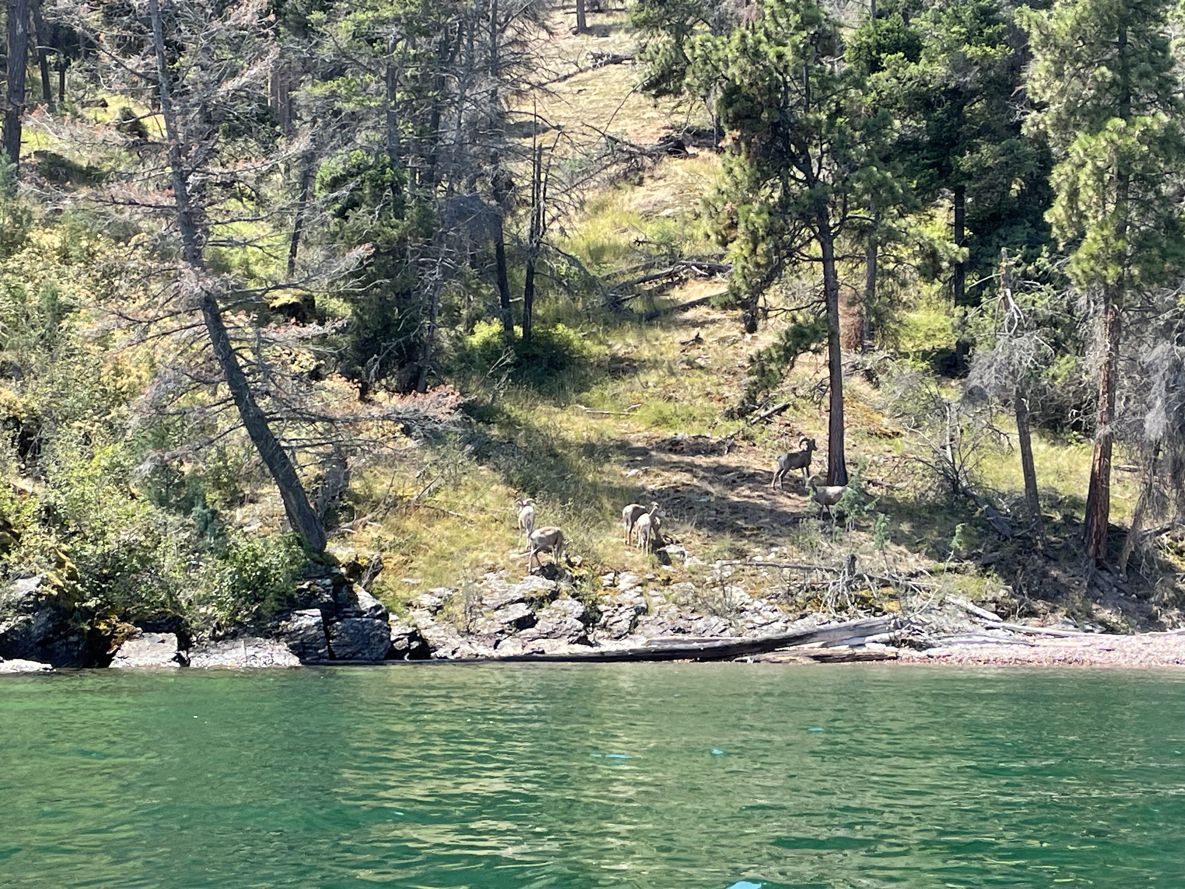 On July 23, the weather seemed perfect for a paddle out to Wild Horse Island. I began by paddling through a stiff headwind to reach the east shore of the Island, swam a couple of times off a driftwood-covered beach, then proceeded counterclockwise around the island, pausing again on the west shore before letting a faint tailwind push me back to my starting point. During the day I noticed my tendency to skip over some things in the field of awareness, but I kept reminding myself, influenced by qigong, to attempt to see the whole. As I approached the first cove, I noticed bighorn rams grazing grass and forbs on the slope above the beach.