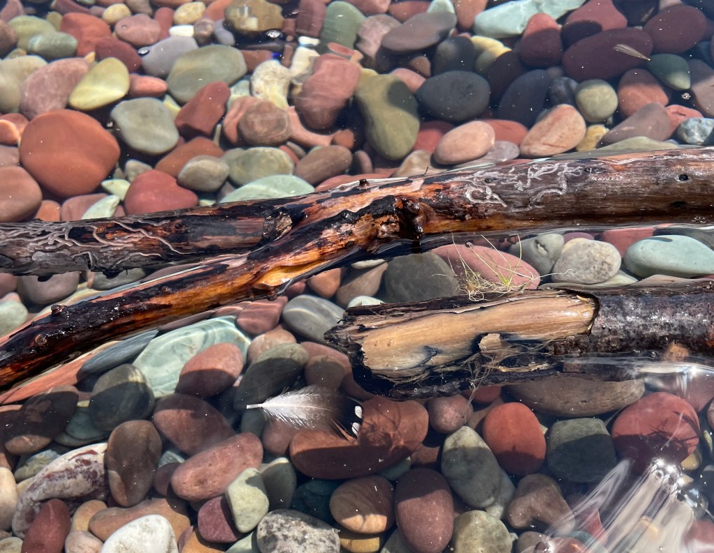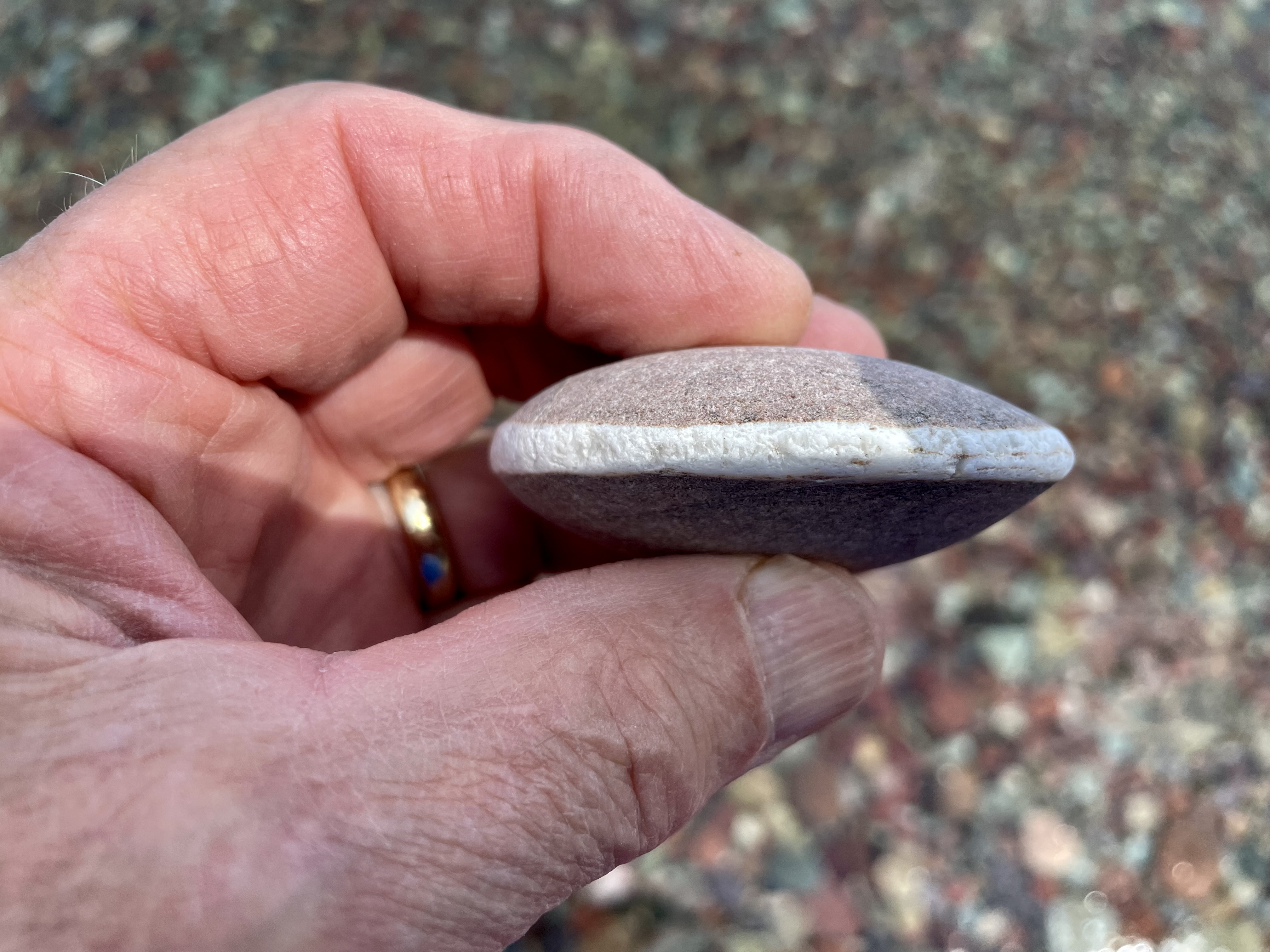 Beyond that, I reminded myself to notice two stones that seemed to have washed downstream from the same strata and were distinctly different from surrounding stones, a stone that reminded me of a flying saucer, and then a floating feather unlike any feather I had ever seen, one with two white dots in a black field.
