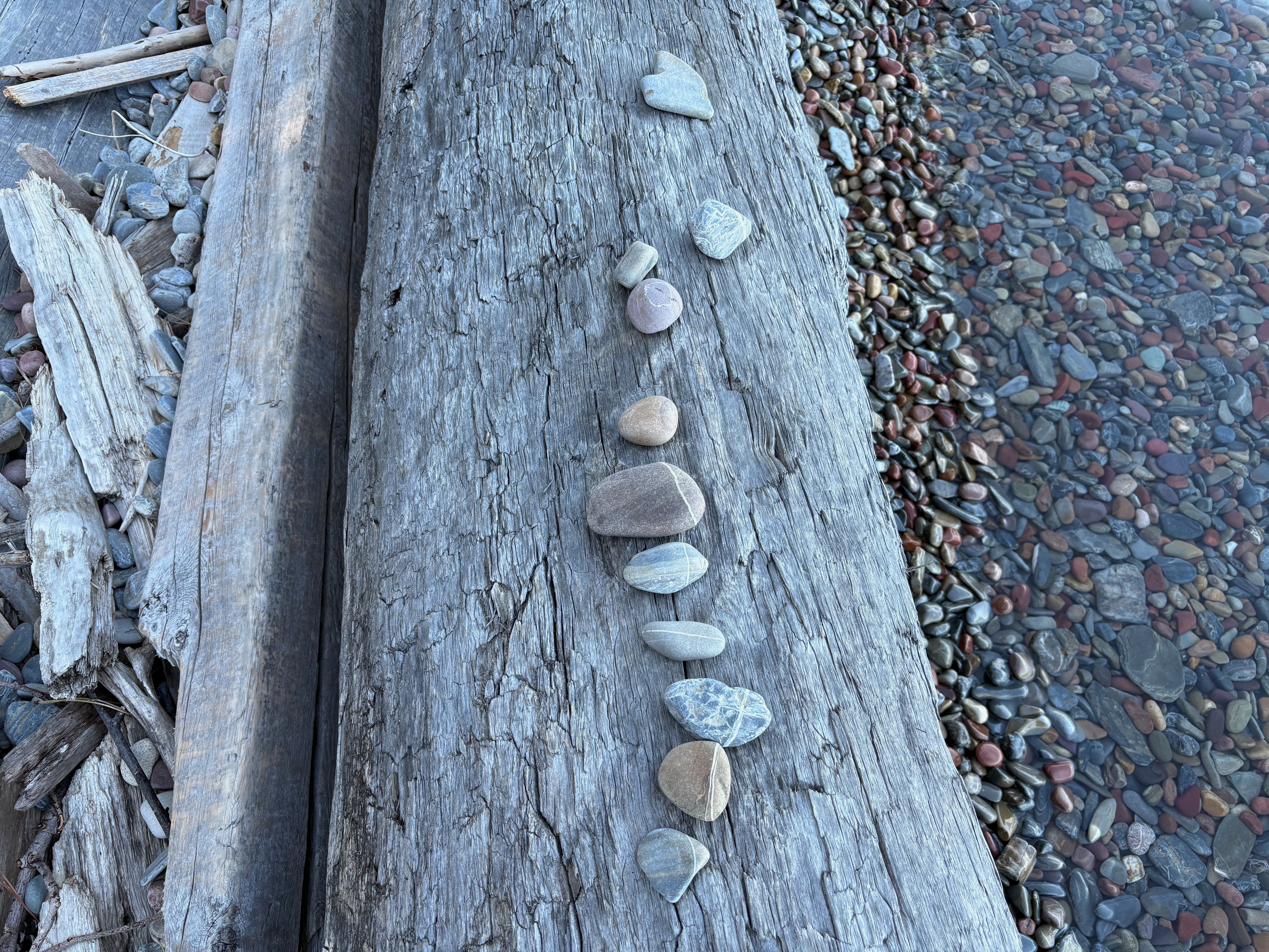 During the remainder of the afternoon, I wandered all over the island, re-familiarizing myself with the location of things I remembered—trails old and new, a memorial to a man who died at 55, the tattooed bungalow (an unholy Lascaux), and the location of the new tent sites created by Montana Fish Wildlife and Parks. In the process I found an artistic arrangements of stones with a common theme