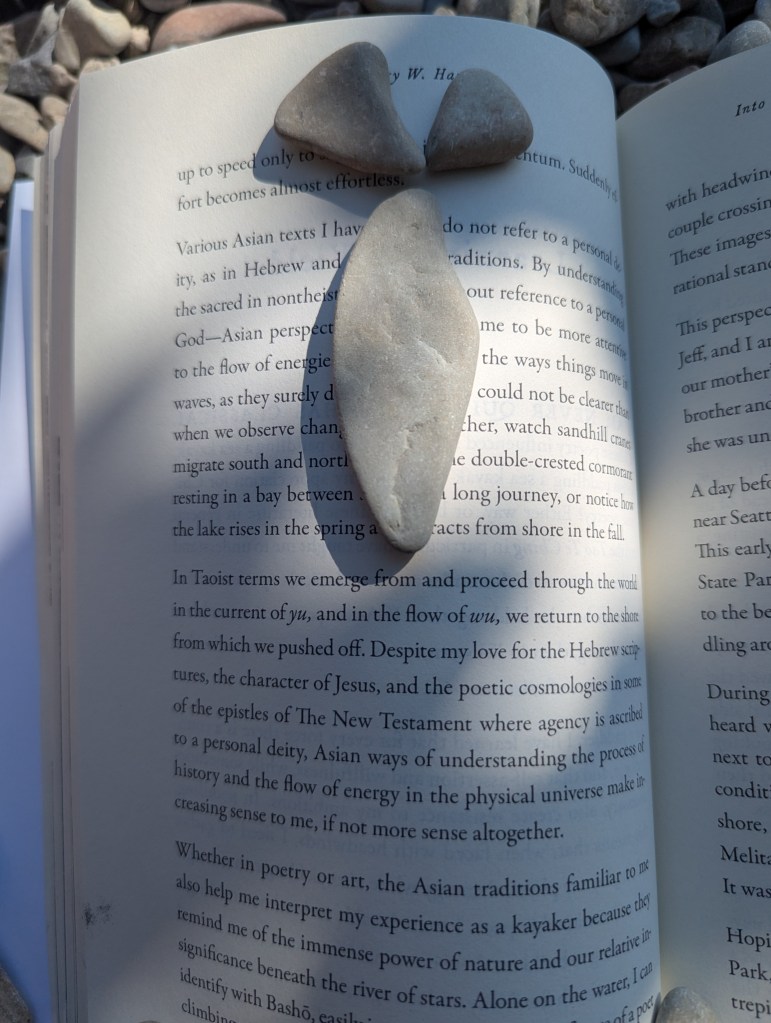 As people begin to read the book, they tell me that they are approaching it as if it were a daybook: they read one of the short essays each day and take time to ponder its themes. Another person sent me photos of her amazingly creative response. Constanza von der Pahlen, whom I met at the first public reading of the book, arranged Yellow Bay stones on the pages to reflect images in some of the essays.