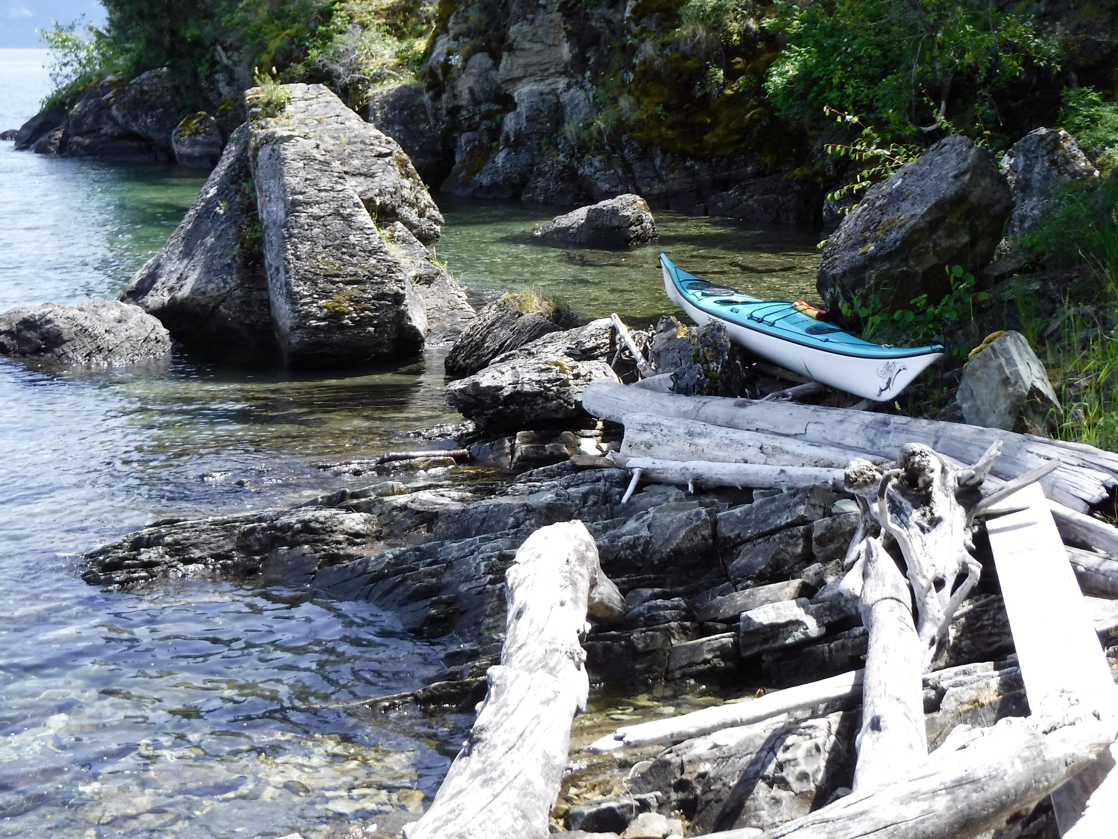 After leaving the cove I noticed two kayaks traveling east. Again, trying to practice a way of seeing, I slowed down and adjusted my course as we converged from different directions. The woman asked about my “strange looking paddle.” This led to a wonderful conversation about Greenland paddles and then an even more amazing conversation about an academic background the man, my father, and I had in common, all in the middle of the lake. When I reached the west shore all my favorite spots were occupied by other people. Eventually I found a few square feet of gravel where I could secure my boat during a brief hike. I climbed a steep slope up to a bench, noticing that this trail was well traveled by animals on the island. After a brief exploration of the area, I dropped back to my boat. After lifting Bluebird over some sharp boulders and into the water, I felt a faint tug of intuition suggesting that I needed to simply stand still. I kept in touch with my bobbing boat by letting small waves push the kayak into the back of my legs while I kept watching the slope above me. Moments later about 30 bighorn ewes and lambs came bounding down the same slope I had climbed. They poured over logs and boulders, tried to balance on driftwood rolling in the waves, and walked past me, almost as though I was invisible.