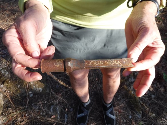 We also discovered a memorial to a young man. People who loved him wedged a painted tribute between opposing pieces of rock. Later, my friend Jeanne spotted a remnant from his tool collection. Walking between her tent site and the beach she saw an anomalous piece of rusted steel pushed level with the surface of dry moss and stone. Curious, she withdrew it from the ground and showed it to me. I explained that the object was a hollow chisel, a tool used to chop mortises so two pieces of wood can be joined with a tenon. Using gold-colored ink, someone painted messages of love and the man’s birth and death dates. Seeing this tribute, we speculated he might have been a woodworker. After we admired the tool and its subtle placement, we put it back exactly as we found it.