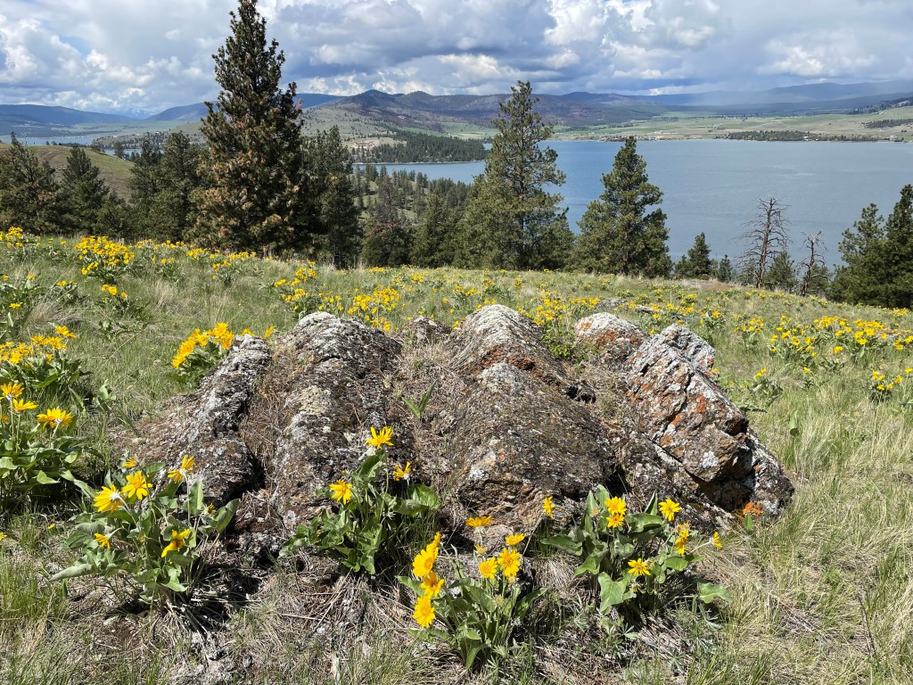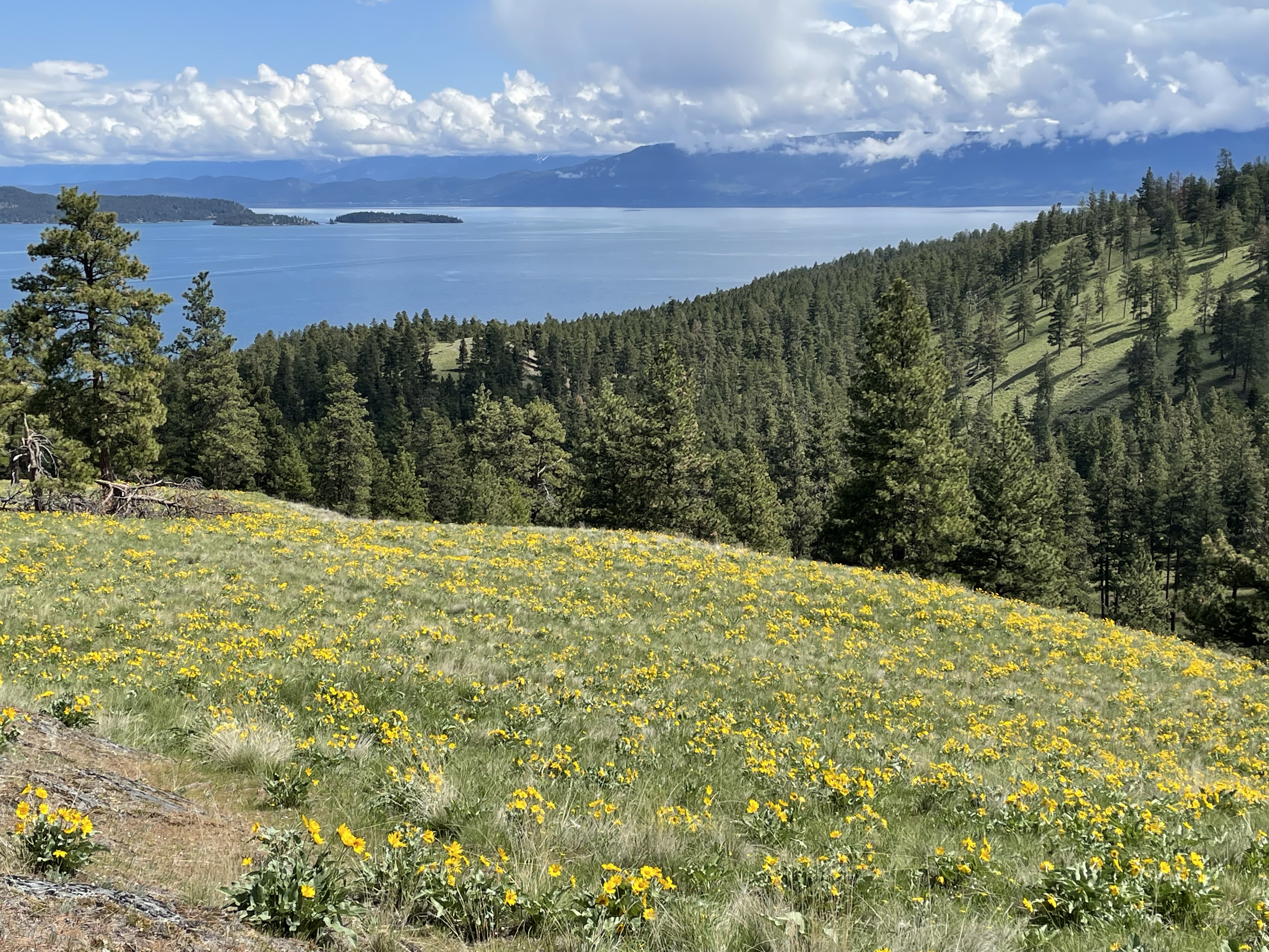 After I gained some elevation, I chose my own path through tall grasses along the edge between meadow and forest, hoping to find an animal trail and see a greater variety of flowers. As I walked along, I picked you an imaginary bouquet. As there are no rhododendrons and roses like you grew when you lived in in the Seattle area, I found the spring blossoms of the mountain west—arrowleaf balsamroot, larkspur, lupine, long-plumed avens, camas and the occasional shooting stars on the north-facing slope and forest edge. Near the top of the island I sat down and dangled my legs over a cliff. I had a perfect vantage point to look for more Bighorn sheep if they came into the small clearing far below, but they were elsewhere and not on the move. I ate my lunch and listened to the wind.