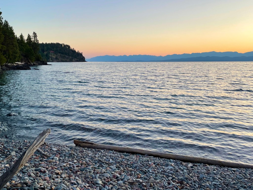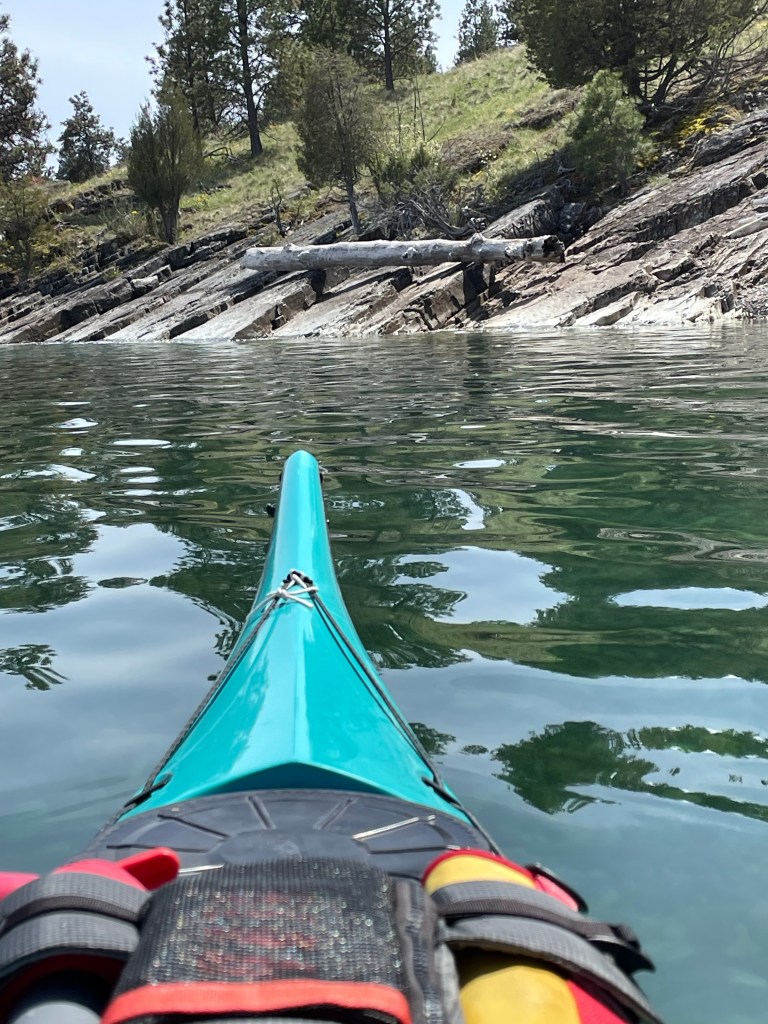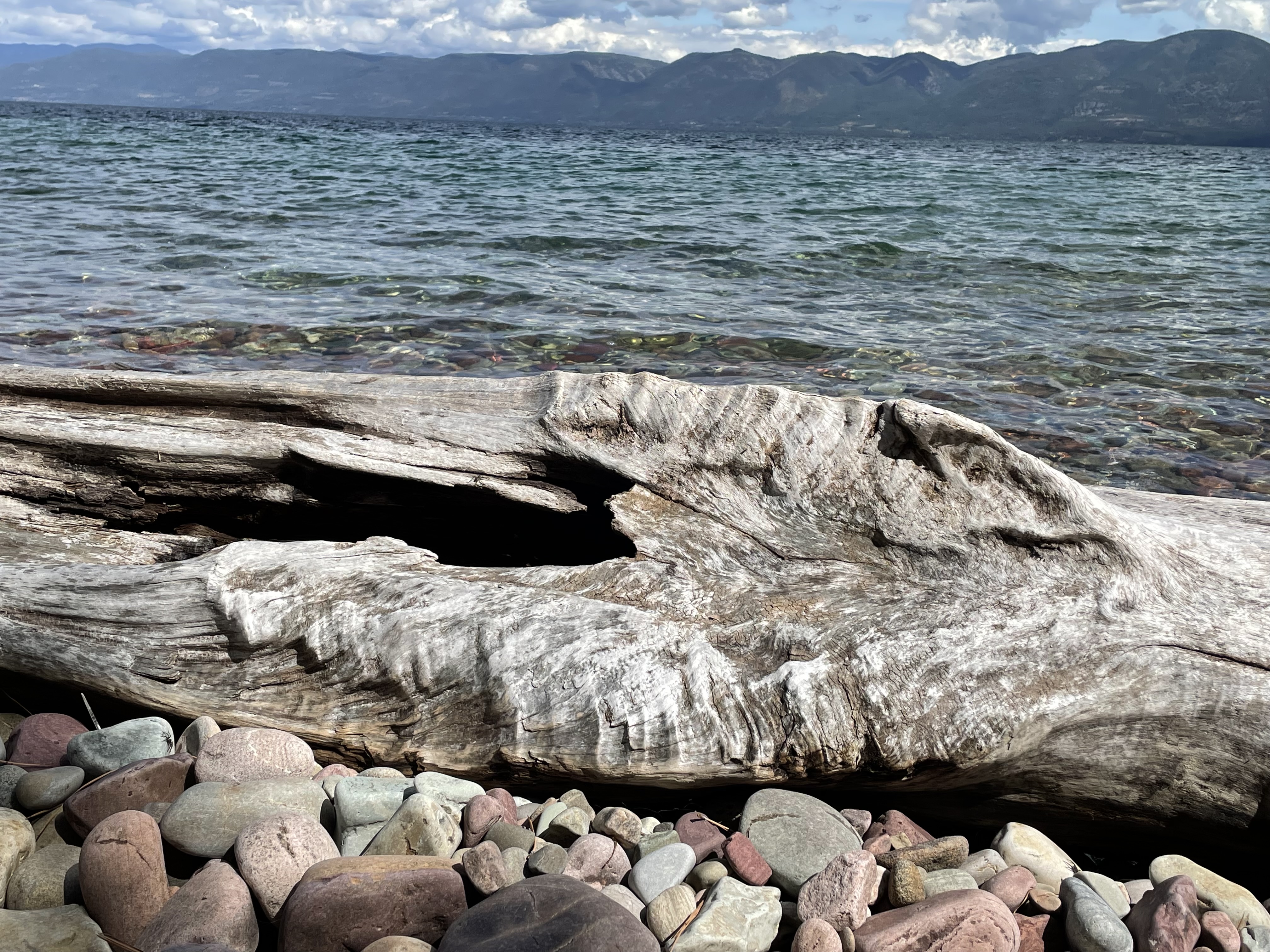 With the smoke in a blue-gray band above me, I stroked out of the marina at Finley Point, made a right turn and headed for Bird Island. I quickly fell into that beautiful rhythm of harmonious breathing timed to the pace of my strokes. Though I have made this paddle countless times, something about the island was different. Through the haze I could see that Montana’s Fish, Wildlife and Parks had installed a solar toilet near the south end of the island, above the beach where many people come ashore. I applaud their decision to reduce waste on the fragile island. Continuing north I saw the black blocks of stone that mark the entrance to one of my favorite coves near the opposite tip of the island. Rounding this angular corner I saw a cove I hardly recognized. Instead of a little bay with an incredible view and an accommodating beach, this half circle of shelter was choked with logs that had washed down from the north, trees that had fallen since the island burned, a massive, bleached post, and lots of lumber ripped from docks, nails in the air. There was barely enough room to slide my kayak into a secure position while I walked over the debris and dove into the water from one of the blocks of stone.