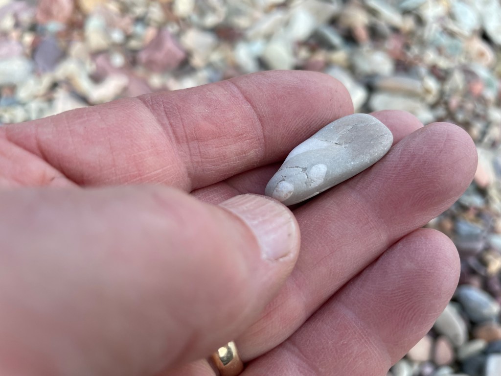 Though I had visited this spot several times, usually while circumnavigating the island, this time I decided to look more closely. I noticed many things I had ignored or overlooked. With the lake at a lower level I saw harder stones trapped in the mudstone ramps that once formed the floor of the lake basin and may have been part of the foundation of the mountains raised by shifting tectonic plates. I found a miniature version of the process among the countless stones on the beach.