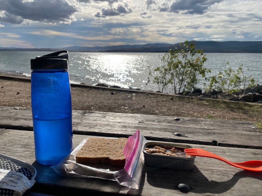 Having a whole day and an evening to enjoy the experience, I put my extra food on the picnic table for an early dinner of sardines, Dakota bread from Great Harvest bakery and a crisp apple. Unfortunately, I was out of monster cookies.
