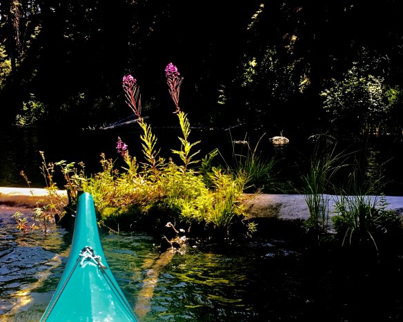 Looking back I see clearly that not every paddle needs to be an epic adventure. Just as it is possible to stroll along a river trail or wander through an old neighborhood, it is possible to paddle in a desultory way. For example, I remember an afternoon on Lake Alva. The membrane of consciousness registers the skittering of ducklings, the ruffled surface of baitfish trying to escape a predator, the stillness of a heron in the slow water below a beaver dam. After paddling across the lake and into one of its coves I remember sitting still in my kayak and marveling at fireweed growing out of fallen log. A slant of light fell through the forest and raised the flowers into a purple torch. After exploring the outlet of the lake, I returned to my wife’s fancy picnic of smoked salmon, Struan bread, fresh cherries from local trees, and Gorgonzola cheese. Sometimes paddling is less about working toward a destination and more about gaining a greater appreciation for the quietness at hand, the sound of a little girl speaking to her attentive grandfather and listening to him gently respond as he sat sunning himself on the beach.